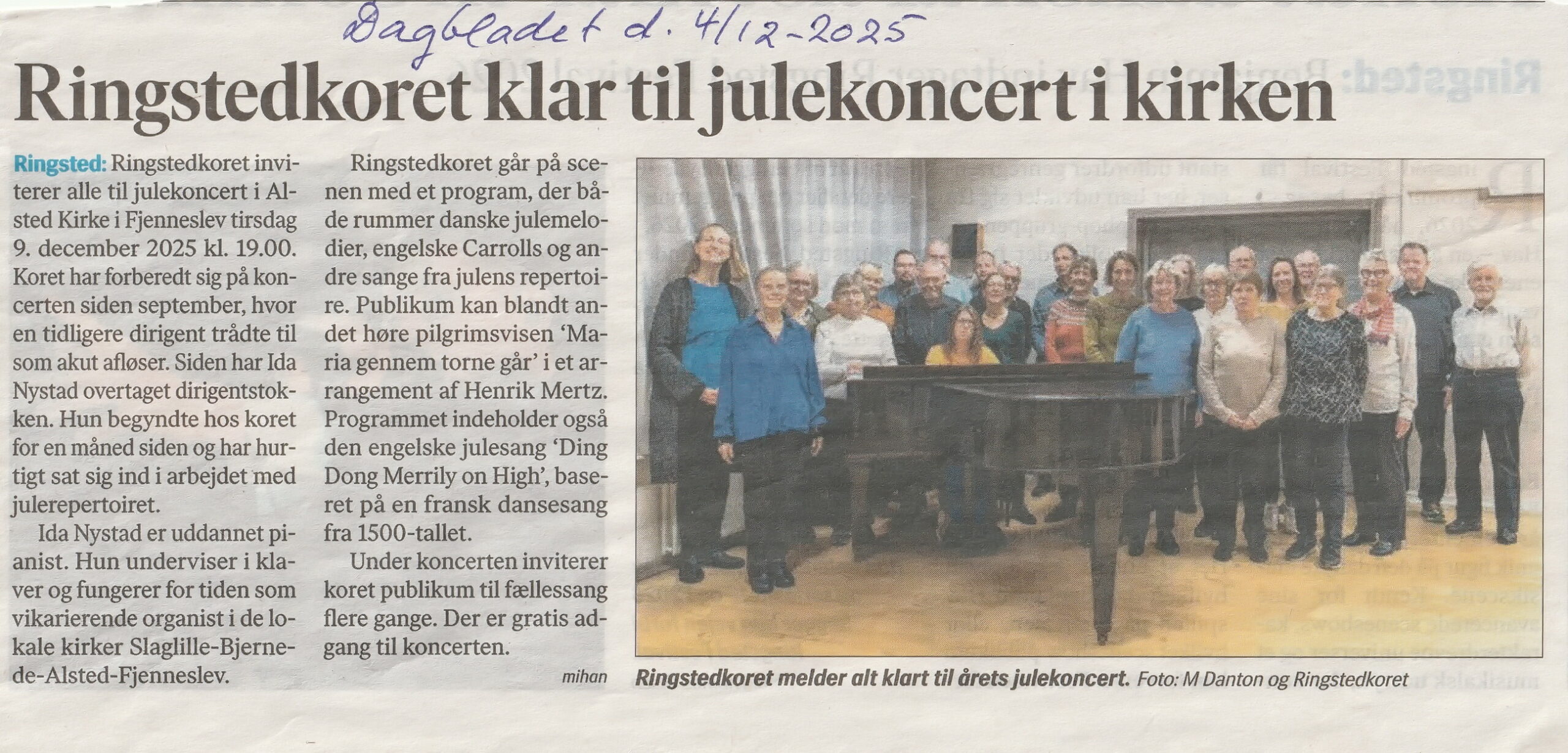 Ida Nystad startede for en månedstid siden, og fik meget hurtigt sat sig ind i Ringstedkorets forberedelser til julekoncerten i Alsted Kirke. Koret var allerede begyndt at træne julerepertoiret fra september måned, hvor en tidligere dirigent så venligt var trådt ind som akut afløser, indtil Ida blev ansat.